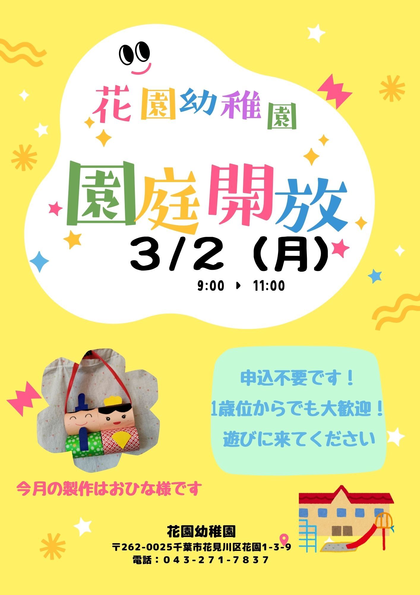 ● 2026. 3月 2日 園庭開放です ☆翌3日はひなまつり♪おひなさまを作ります。ぜひご来園ください!!
