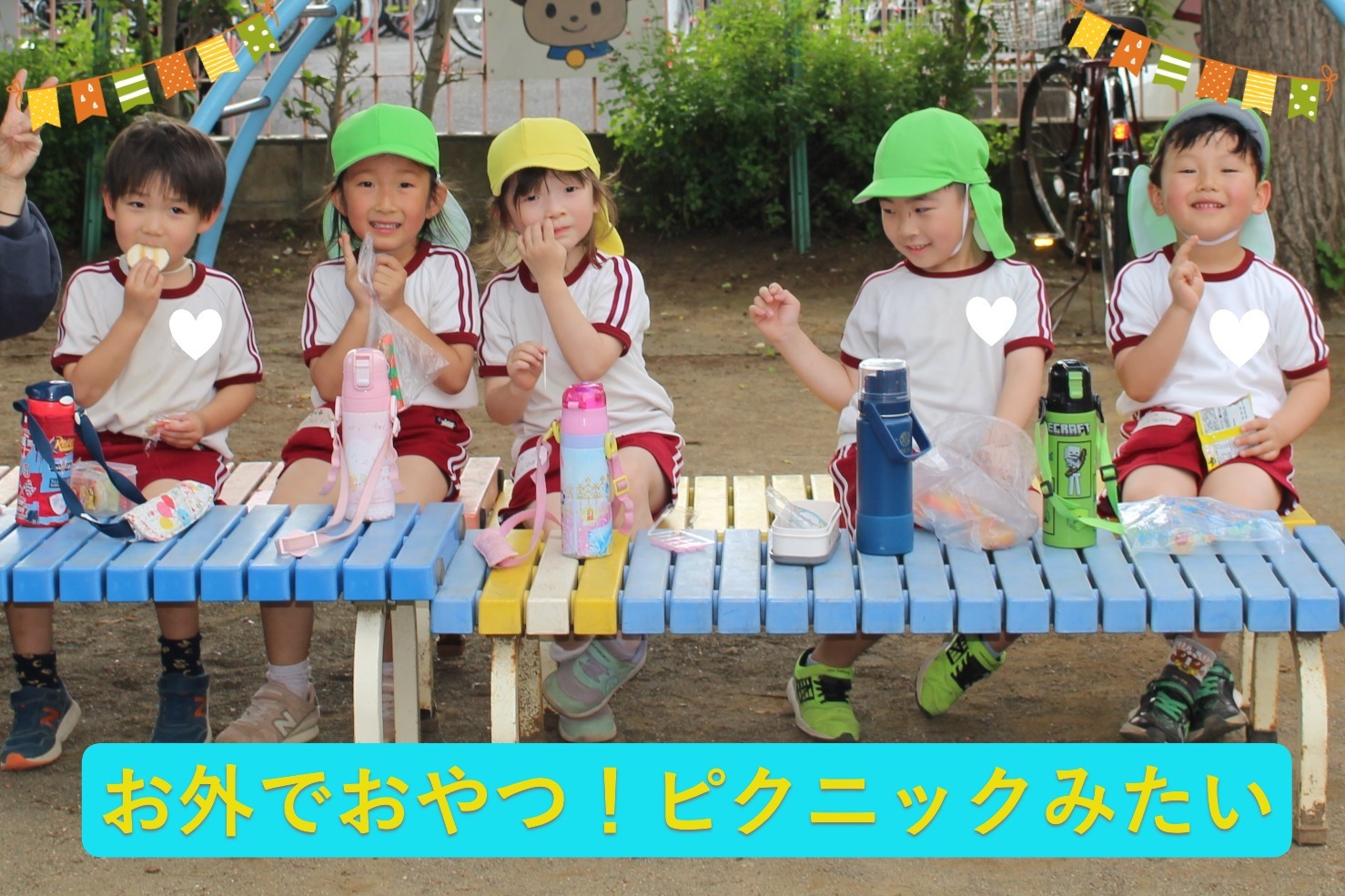 おやつを外で食べてピクニックごっこもしています。