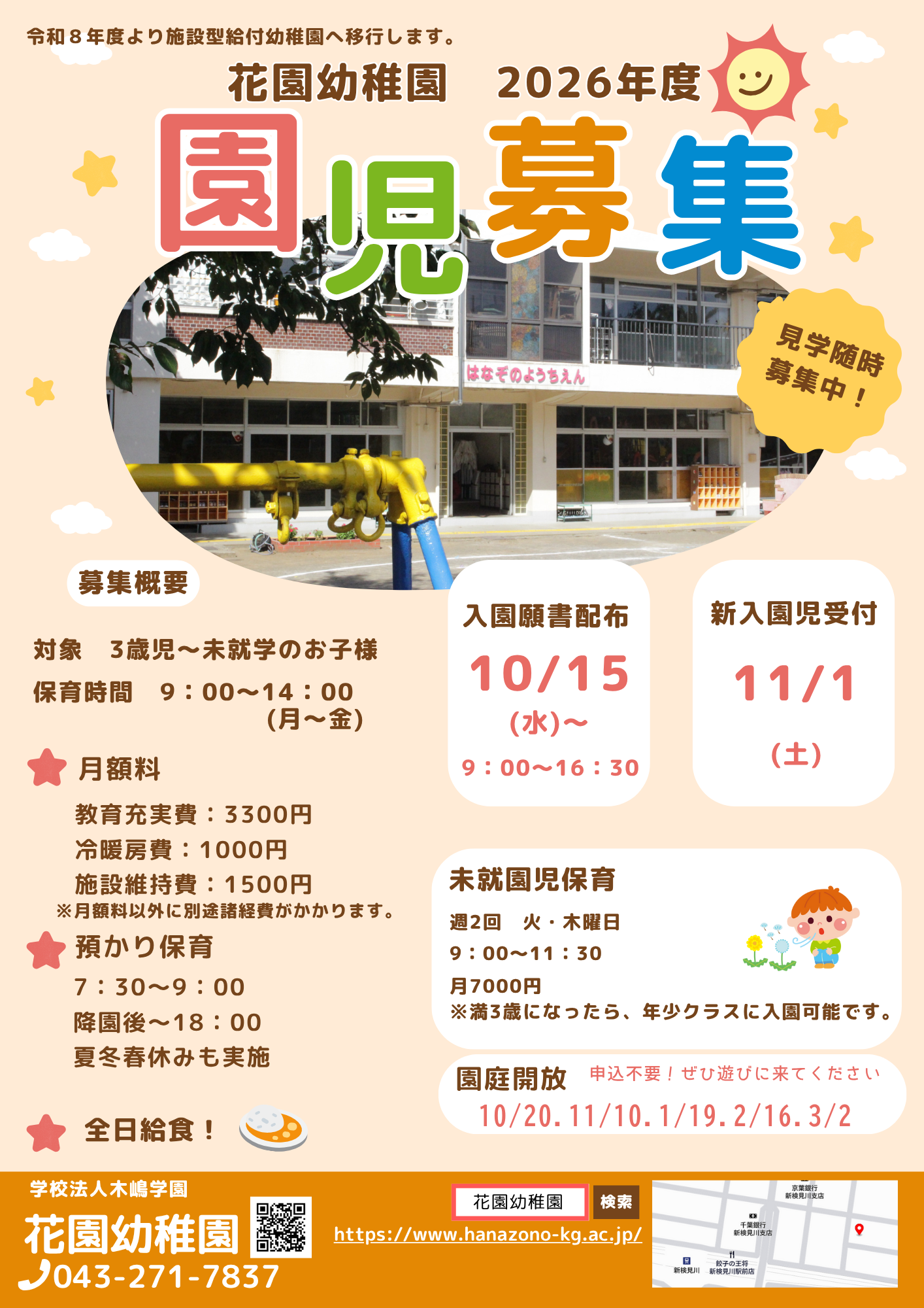 ○ おやつ(15時頃)はお家から持参してください。 ・ 急な預かり保育やおやつを忘れてしまった場合は園で用意します。(おやつ代:80円をいただきます)